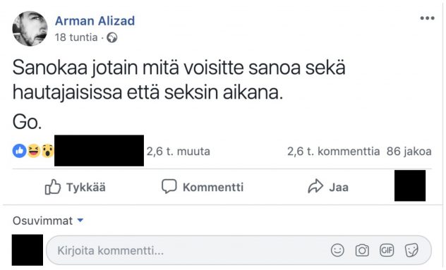Arman Alizadin Facebook-julkaisu keräsi tuhansia kommentteja ja kymmeniä tuhansia reaktioita.