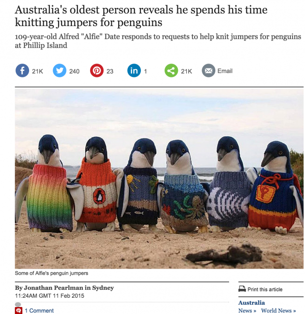 Öljytuhot Australian etelärannikolla ja Uudessa-Seelannissa ovat turmiollisia alueen pingiviineille – etenkin öljy- ja kemikaaliherkille sinipingviineille. Paikallinen pingviinejä suojeleva säätiö onkin vedonnut kansalaisiin ja pyytänyt, että ihmiset ryhtyisivät neulomaan sinipingviineille suojaavia villatakkeja. Myöskin Alfie on ryhtynyt tuumasta toimeen ja käyttää vanhainkodissa aikansa pingviinineuleita kutoen. Vuonna 2001 sinipingviineille kudotut villapaidoit auttoivat suojelemaan noin 96 % yli 400:sta pingviinistä, jotka joutuivat kosketuksiin öljyvuotojen kanssa. Pingviinejä suojelevan säätiön puheenjohtajalla on hyviä uutisia sen suhteen, että tällä hetkellä villapaitoja on jo kudottu riittävästi alueen sinipingviineille. Lähde: HS.fi, The TelegraphLUE MYÖS: