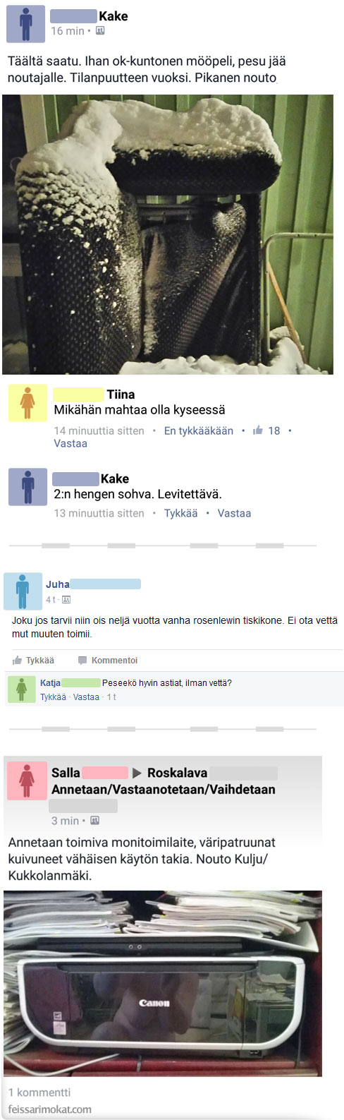 Ihmiset ovat olleet jälleen anteliaita. Toinen kauppaa hyvässä kunnossa olevaa sohvaa ja toinen tulostinta.