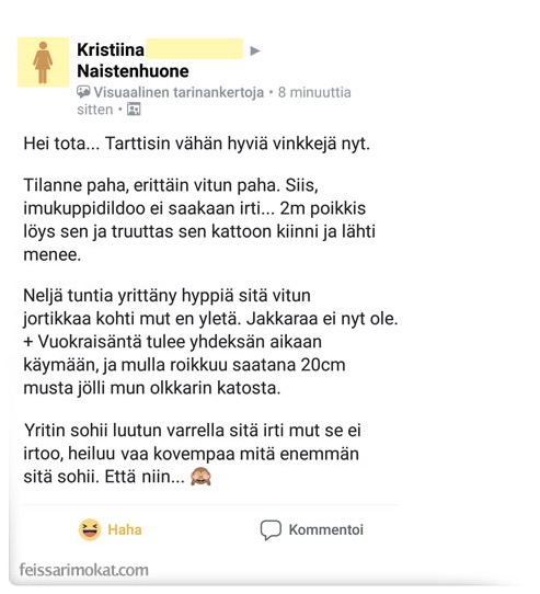 Nyt Kristiina kysyy apua Facebookissa, jotta hän saisi imukuppidildon irrotettua katosta ennen kuin vuokraisäntä saapuu kahville.