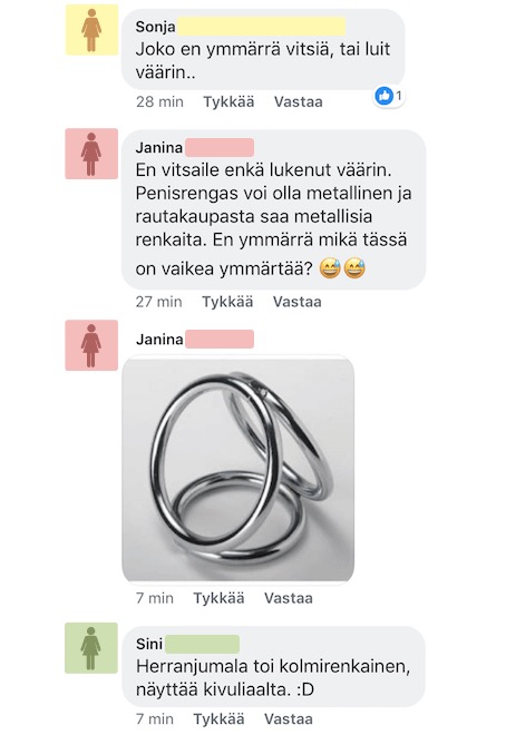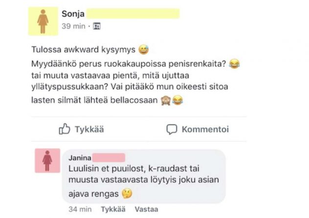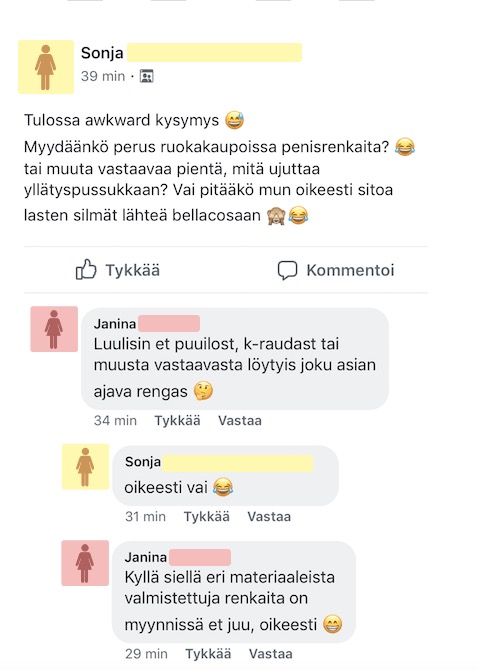 Sonja etsi ruokakaupasta penisrengasta, mutta saikin kuulla että sellaisen löytää helpommin rautakaupasta.