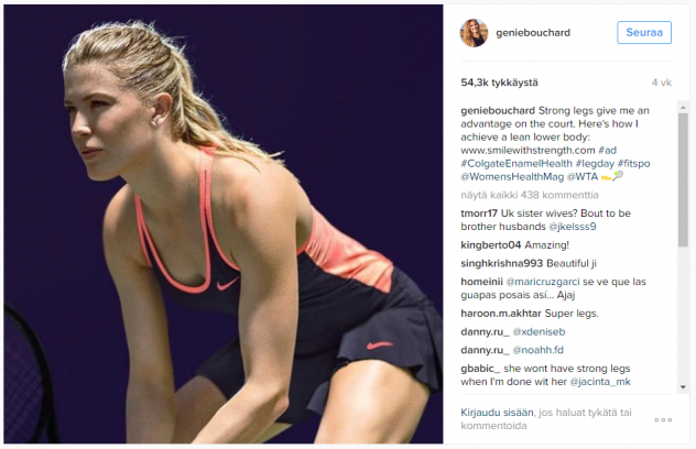Kanadalainen tennistähti Eugenie Bouchard ei häpeile näyttää kaunista vartaloaan Instagramissa. Nuori 22-vuotias kaunotar on voittanut urallaan yhden WTA-turnauksen kaksinpelissä ja parhaimmillaan hän on ollut kaksinpelissä WTA-listan sijalla kuusi elokuussa 2014.