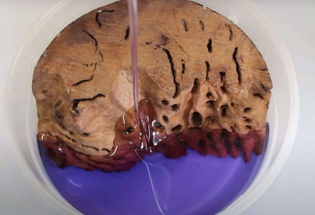 Mies kaataa liuoksen huokoisen puun päälle – lopputuloksena syntyy upea lamppu