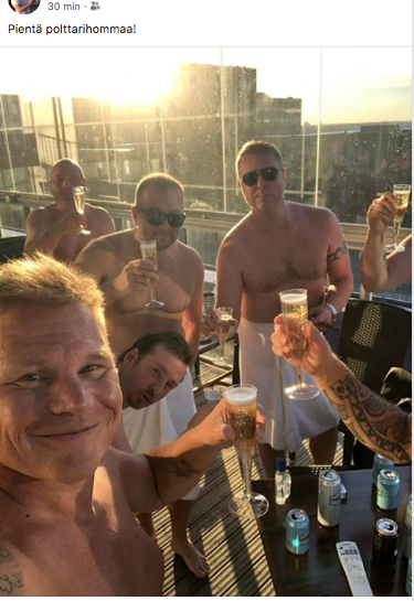 Joka tapauksessa kaveriporukalla on ollut lystiä saunoessa ja virkistysjuomista nauttiessa.