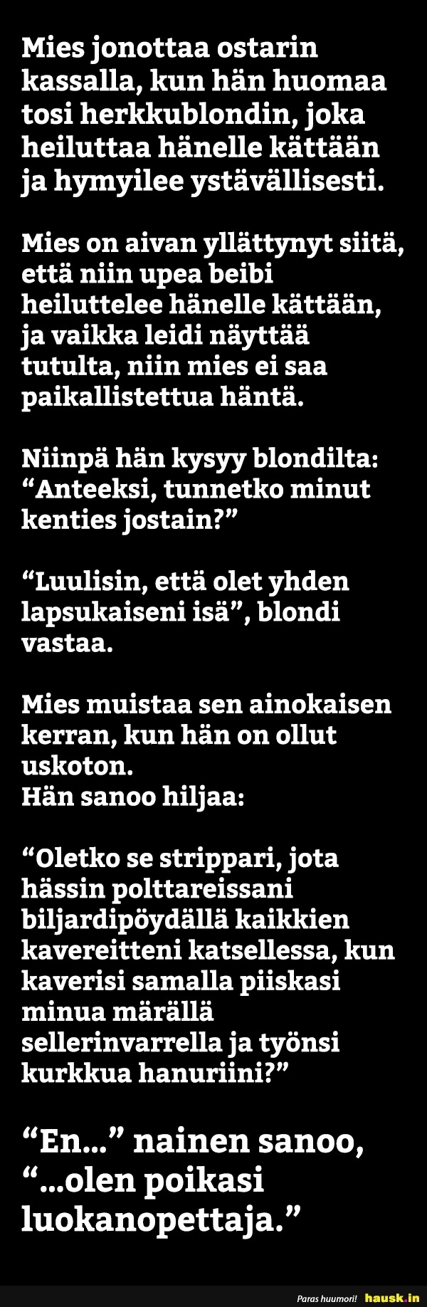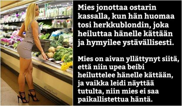 Suomalaismies oli tavannut kaupan kassalla kuuman blondin, joka vaikutti todella tutulta. Mies päätyi kuitenkin nolaamaan itsensä totaalisesti, kun hän muisti blondin olevan eräs toinen nainen… Voit lukea fiktiivisen tarinan alapuolelta! :D
