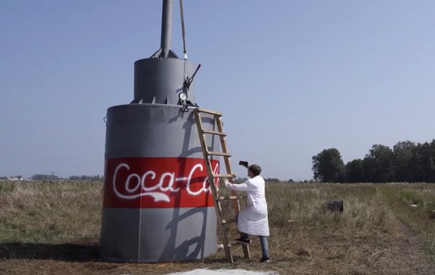 Harva on kuitenkaan vaivautunut ostamaan yhtä tai kahta pulloa enempää tämän ”tieteellisen kokeen” suorittamiseksi. Noh.. nämä nuoret ”tiedemiehet” kokeilivat millaisen paukun saisi aikaiseksi, kun mentos-jauhetta sekoittaisi 10 000 litraan Coca Colaa. On sanomattakin selvää, että reaktion aiheuttama paine oli melkoinen.