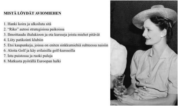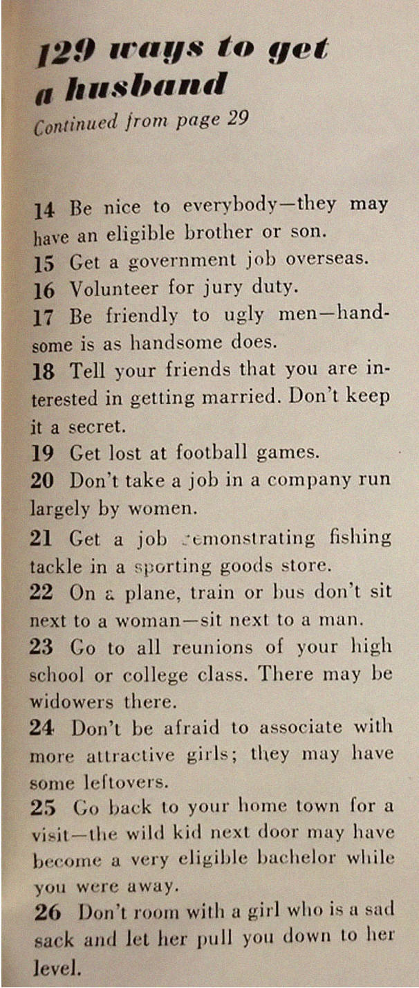 Ottaisitko mallia 1958 vuoden aikakauslehdestä, jossa ohjeistetaan kuinka naiset voivat hankkia itselleen aviomiehen?