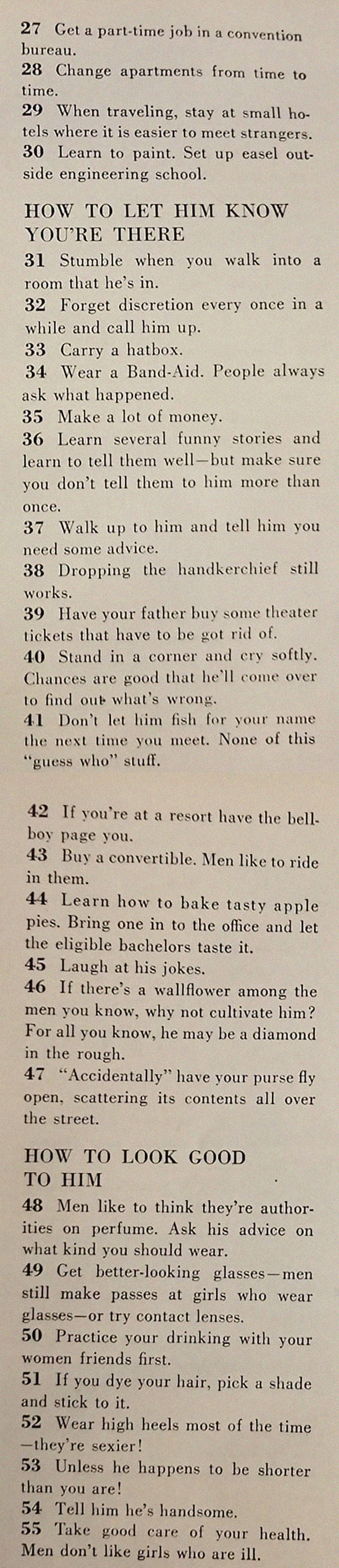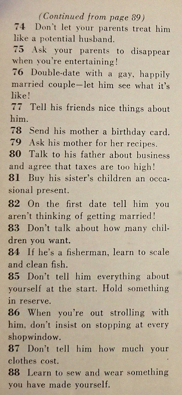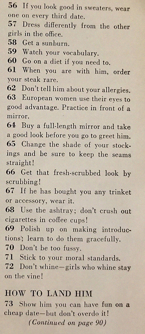 ”Ostin McCall’s aikakauslehden vuodelta 1958 koska kannessa oli mainos, joka mainosti lehteä otsikolla ”129 Ways to Get a Husband” (suomennettuna ”129 tapaa hankkia aviomies”) ja en todellakaan pettynyt. Koko lista oli täynnä ”mitä v*ttua”, mutta henkilökohtainen suosikkini (#40) on saanut minut purskahtamaan aika ajoin nauruun siitä lähtien, kun luin sen kolme päivää sitten”, Kim Marx-Kuczynski kirjoitti Facebookissa. Sen kummemmitta puheitta – voit lukea jäätävät ohjeet alapuolelta! :D#1