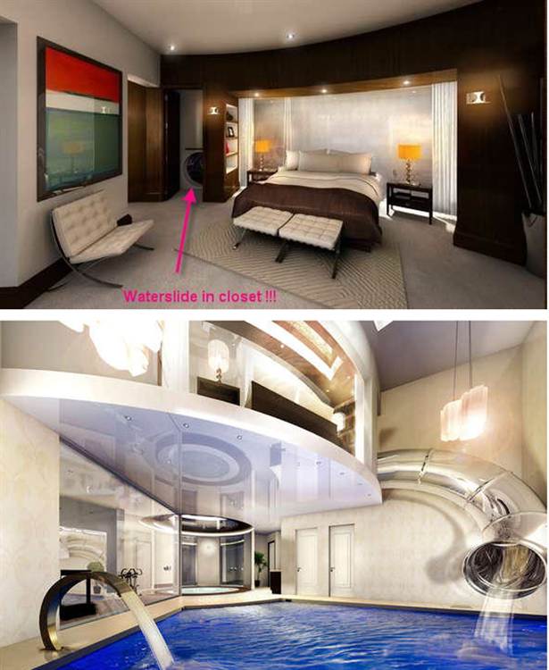 Vesiliukumäki makuuhuoneessa, kaksikerroksinen vaatehuone tai vaikkapa maanalainen autotalli.