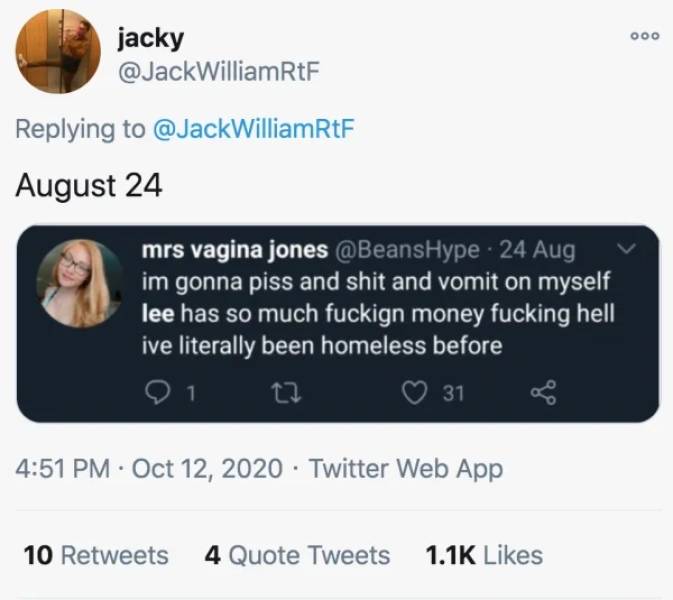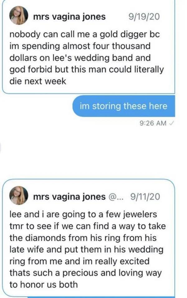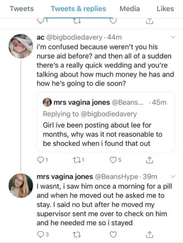Vagina Jones on monta kertaa hehkuttanut kuinka paljon rahaa yli 90-vuotiaalla papparaisella on ja maininnut myös perinnöstä. Nainen ei tunnu potevan minkäänlaista syyllisyyttä, sillä hän kerskuu päivittäin netissä parisuhteensa hyvillä puolilla.
