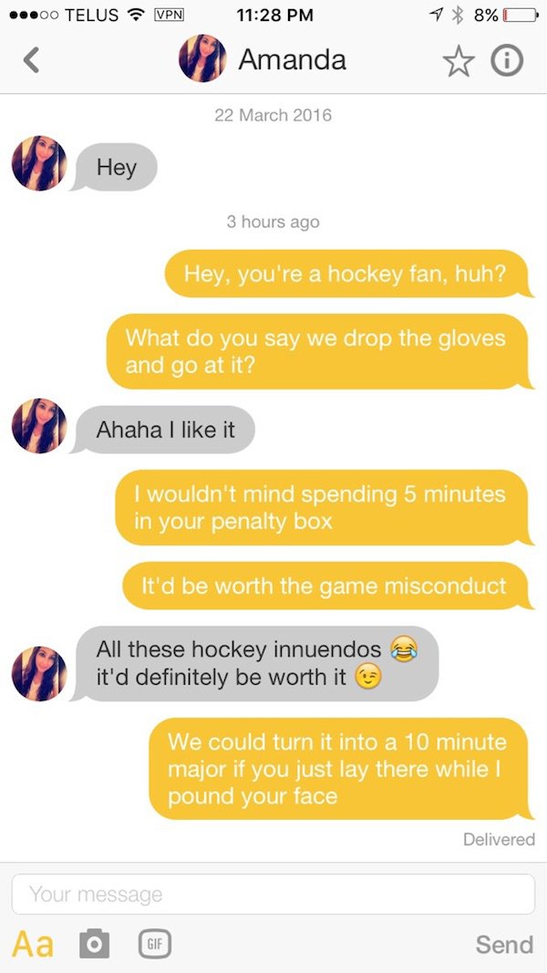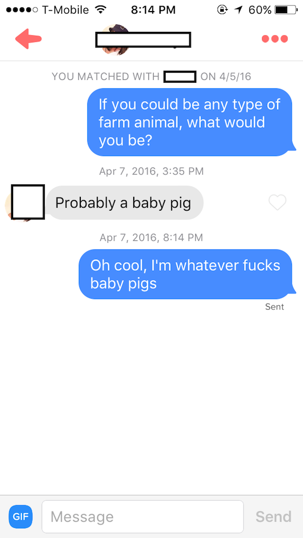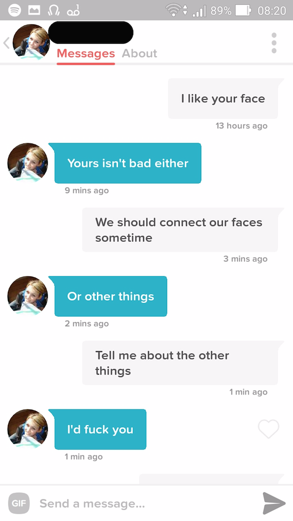 Moni menee Tinderiin pelkästään hauskanpito mielessä, eikä vakavammat suhteet kiinnosta. Tämä usein näkyy myös profiileissa ja tyyleissä, joilla ihmiset puhuvat toisilleen. Alta 22 tilannetta, jossa ei sanoja säästelty, vaan mentiin suoraan asiaan:1.