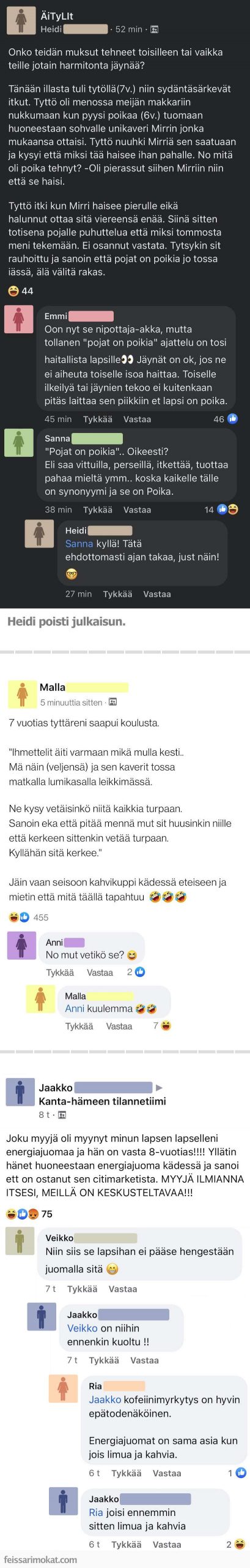 Facebookissa keskusteltiin pikku pojista ja siitä onko ”pojat on poikia” -tyylinen kasvatus vahingollista. Toisessa julkaisussa eräs tomera pikkutyttö ilmoitti äidilleen, että hän tuli myöhässä kotiin, koska vetäisi turpaan paria poikaa. Äiti kertoi ymmärrettävästä syystä, että kahvit menivät hänellä väärään kurkkuun.