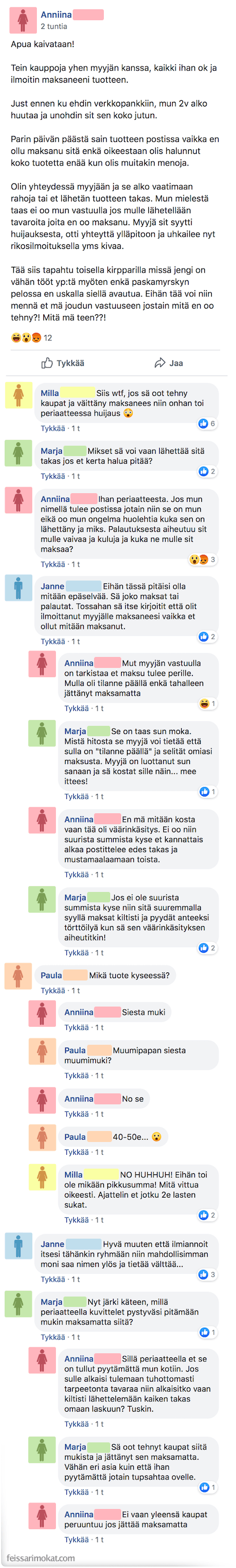 Anniina oli sopinut kaupat Facebookin kirpputorilla, mutta hänelle oli tullut muutama muuttuja matkaan, jonka seurauksena maksu oli unohtunut. Anniina ei kuitenkaan ajatellut, että hänen tarvitsisi maksaa mukista mitään, sillä hän ei ollut siirtänyt rahoja ja myyjän olisi hänen mukaansa pitänyt tarkistaa tämä.
