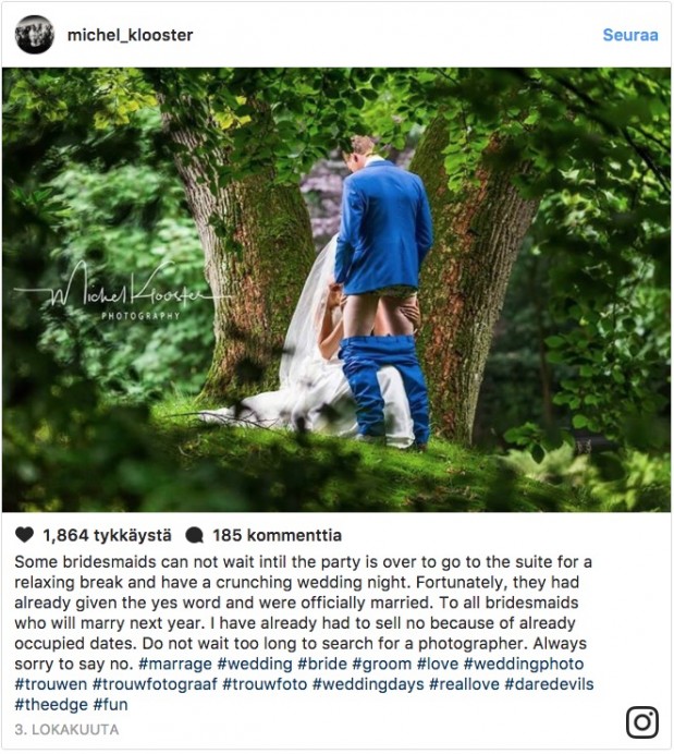 Michel van der Klooster on Hollannista kotoisin oleva valokuvaaja, joka käy ottamassa hääparien toiveiden mukaisia kuvia. Hän on todella suosittu valokuvaaja ja siksi hän on päässytkin valokuvaamaan satoja onnensa kukkuroilla olevia hääpareja. Yksi keikka oli kuitenkin erityisen ikimuistoinen ja Michel tulee varmasti muistamaan sen ikuisesti. Michel oli ladannut ottamansa kuvan saatetekstillä: ”Morsian ei jaksanut odottaa siihen asti, että juhlat olivat päättyneet nauttiakseen omasta hääyöstään. Onneksi he olivat kuitenkin tässä vaiheessa jo virallisesti naimisissa”, Michel kirjoitti. Kuva lähti kuitenkin leviämään odotettua nopeammin ja ihmisten reaktiot eivät olleet kovin positiivisia. Michelin oli lopulta pakko kertoa lisää valokuvaan johtaneesta tilanteesta. Morsiammen äiti oli halunnut ottaa kuvan, jotta nuoret saisivat hääalbumiinsa jotain humoristista muistoksi. ”En halua, että kuvissani näkyy intiimejä ruumiinosia. Tämä on kuitenkin illuusio. Pariskunta oli todella innostunut ja häät olivat erittäin rennot”, Michel toteaa. Morsian ja sulhanen olivat tienneet salakuvasta ja he olivat antaneet luvan sen ottamiselle. ”Se oli hauska idea. Emme halunneet loukata tai ärsyttää ketään. Antaa pariskunnan nauttia elämästään, ei kaiken tarvitse olla niin vakavaa”, valokuvaaja lisäsi vielä lopuksi. Voit katsoa alkuperäisen kuvan alapuolelta: