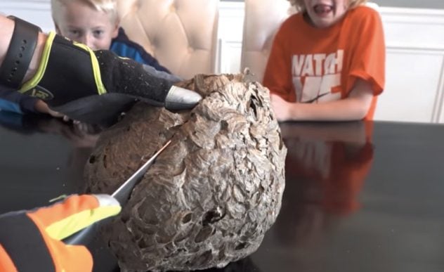 Isä halkaisee hurjan kokoisen ampiaispesän – sisäpuoli loksauttaa poikien suut auki