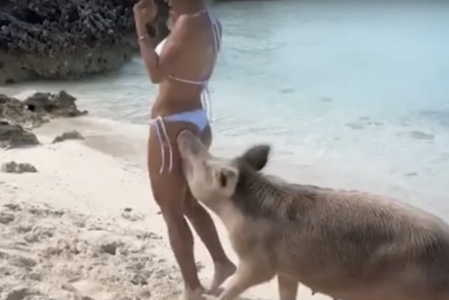 Bikinimalli keikistelee rannalla – sitten sika tulee ja antaa hänelle kunnon opetuksen