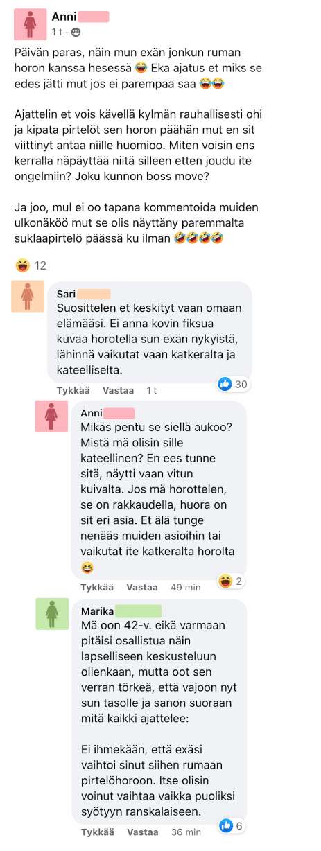 Eräs suomalaisnainen kertoi kohdanneensa exänsä paikallisessa Hesburgerissa. Tapaus herätti selvästi hänessä suuria ja negatiivisia tunteita, jotka purkautuivat myöhemmin sosiaalisessa mediassa. Toivottavasti muiden antama palaute auttoi eron jälkiseurauksista potevaa naista käsittelemään ja katsomaan asioita toiselta kantilta.