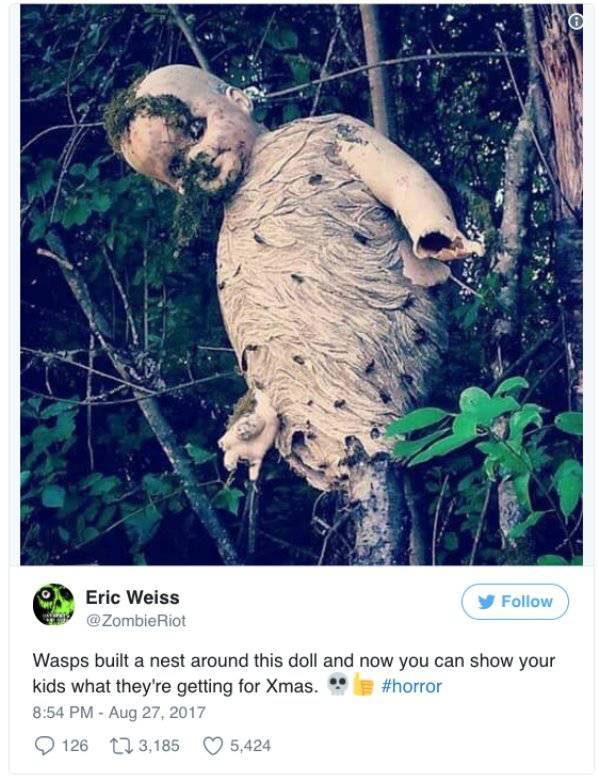 Muistan sen tunteen, kun katsoin nuorena kauhuelokuvia, jotka kummittelivat mielessäni jopa kuukausia – tuolloin tuli useampaan otteeseen todettua, että miksi hitossa piti katsoa kyseinen elokuva?! Karmivat tilanteet, valokuvat ja videot eivät kuitenkaan ole pelkkää fiktiota, sillä maailmassa on olemassa monia asioita, jotka nostavat karvat pystyyn. Oheinen kuvakooste sisältää tappajapupuja, naamareita, pellejä, hämähäkkejä ja muita hahmoja, jotka herättävät ihmisissä pelkoa. Katso kuvat omalla vastuullasi!#1