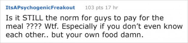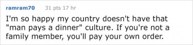 Moni oli sitä mieltä, että kummankin olisi tullut maksaa oma ateriansa.