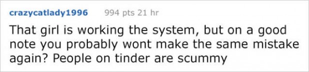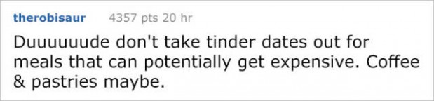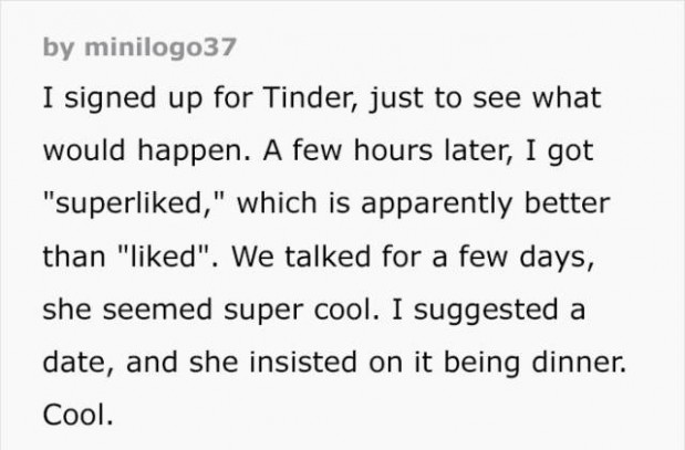 Reddit-käyttäjä oli ladannut itselleen Tinderin ja löytänyt sovelluksen avulla mukavan oloisen naisen. Mies päätti lähteä neidon kanssa treffeille, nainen halusi illallisen, joten mies valitsi omasta mielestään hyvän ravintolan.