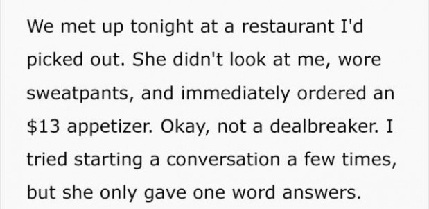 Tapasimme illalla ravintolassa, jonka minä olin valinnut. Hän ei katsonut minua, oli pukeutuneena verkkareihin ja tilasi välittömästi 13 dollarin alkuruoan. Selvä. Yritin aloittaa keskustelua muutamaan otteeseen, mutta hän vastasi minulle vain yksittäisillä sanoilla.