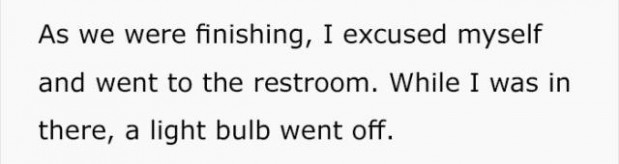 Olimme lopettelemassa ja minun täytyi käydä vessassa. Sillä välin kun olin vessassa, päässäni välähti.