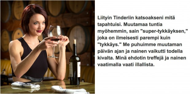 Liityin Tinderiin katsoakseni mitä tapahtuisi. Muutamaa tuntia myöhemmin, sain ”supertykkäyksen,” joka on ilmeisesti parempi kuin ”tykkäys.” Me puhuimme muutaman päivän ajan ja nainen vaikutti todella kivalta. Minä ehdotin treffejä ja nainen vaatimalla vaati illallista.