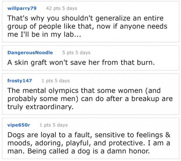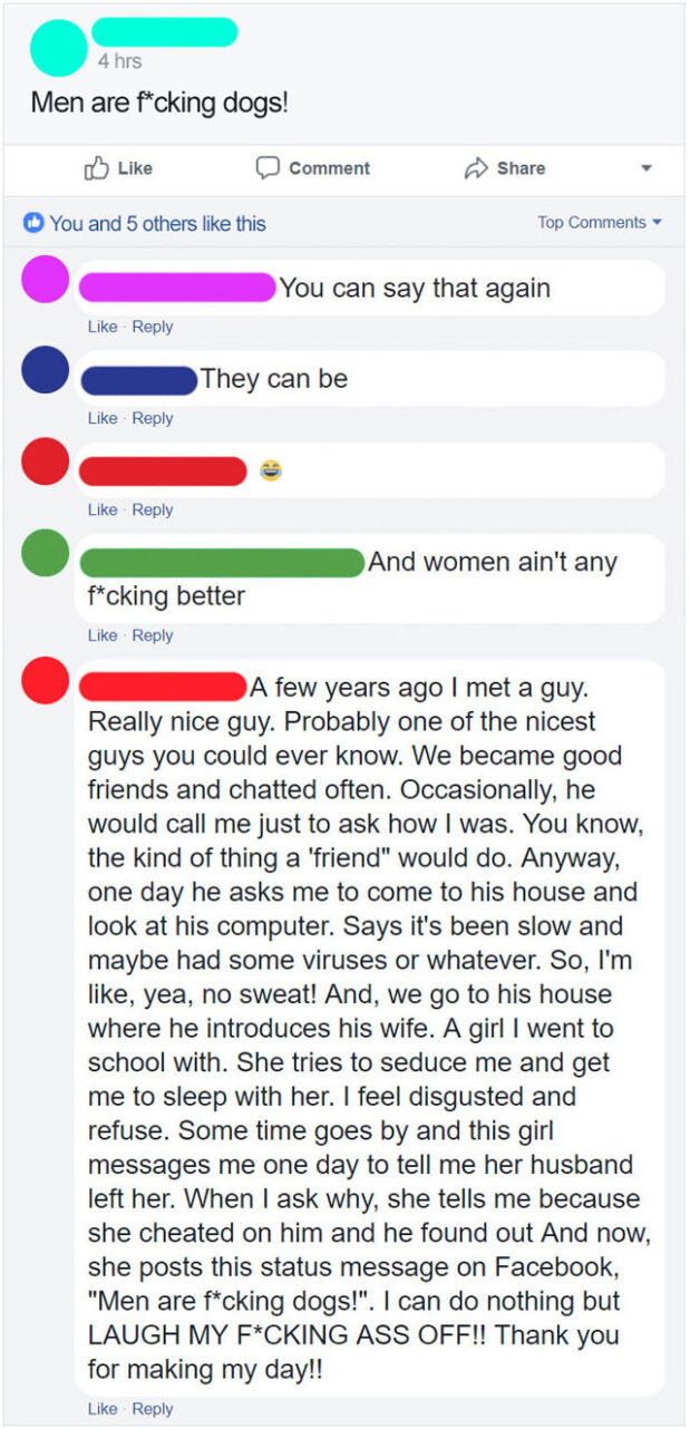 Päivitys sai huvittavan käänteen, kun eräs toinen henkilö tuli kertomaan miksi nainen haukkuu miehiä koiriksi: