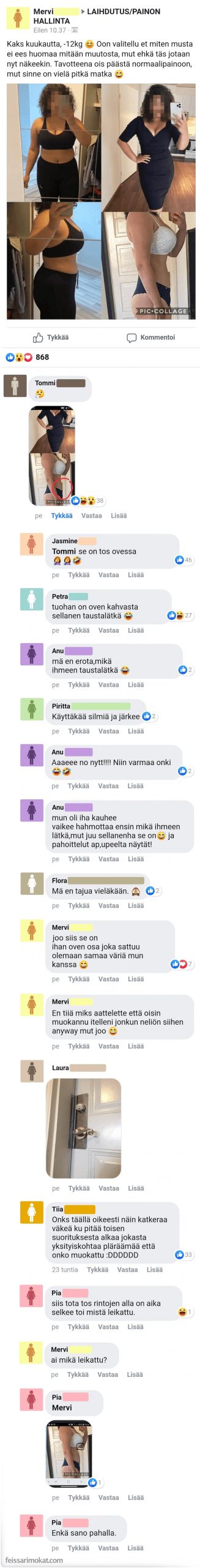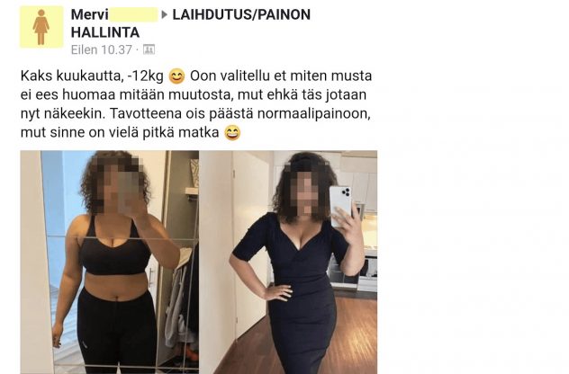 Mervi julkaisi LAIHDUTUS/PAINON HALLINTA -nimisessä Facebook-ryhmässä ennen ja jälkeen kuvia itsestään. Suomalaisnainen väitti pudottaneensa kahdessa kuukaudessa 12 kiloa painoa. Tämä ei sinänsä ole mahdotonta, mutta ei myöskään helppoa – sen sijaan photoshopin käyttäminen on suhteellisen helppoa.