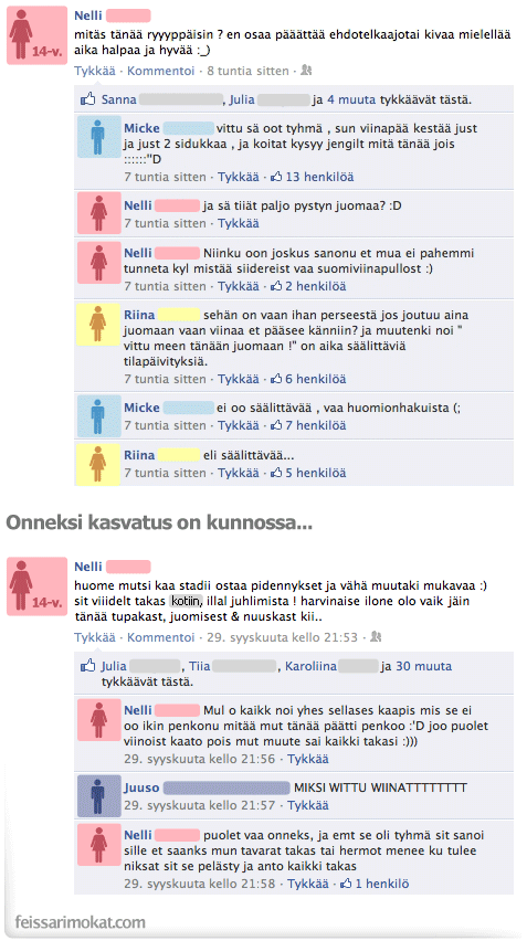 Alkoholia ehtii onneksi juomaan aikuisena niin paljon kuin haluaa, mutta silloinkin tulisi muistaa pysyä kohtuuden rajoissa. 14-vuotias Nelli vaikuttaisi olevan todella huonoilla raiteilla ja toivottavasti hän on saanut apua alkoholinkäyttöön liittyviin ongelmiin. Nelli vetää kanssa nuuskaa ja tupakkaa – tuntuu kuitenkin siltä että hänen tarinoissaan on myös jonkin verran värikynää.