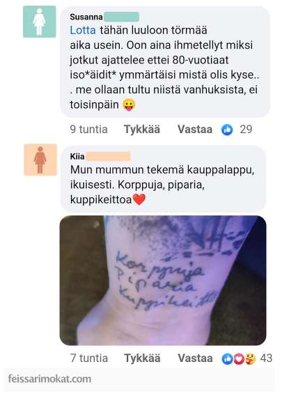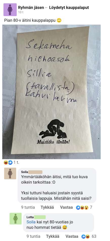 Feissarimokat: 80-vuotiaan mummon härski kauppalappu herätti hilpeitä tunteita