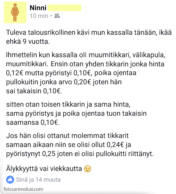 Noin 9-vuotias poika kävi kassalla ja oivalsi, kuinka hän saa kaksi tikkaria – kutsuimme häntä ”talousrikolliseksi” täysin humoristisessa mielessä. Oikea termi olisi varmastikin lähempänä talousneroa. :)