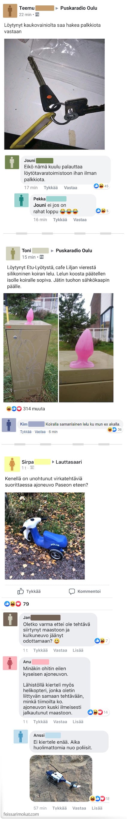 Facebookin ”löytötavaratoimisto” sisältää asiallisten ilmoitusten lisäksi myös huvittavia ilmoituksia, jotka herättävät lukijoissa koomisia reaktioita. Feissarimokat.comilla on tapana koota parhaat julkaisut samaan pakettiin.