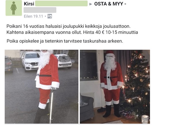 Feissarimokat: äiti mainosti 16-vuotiaan poikansa joulupukkikeikkoja – ei siedä kritiikkiä