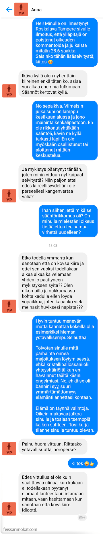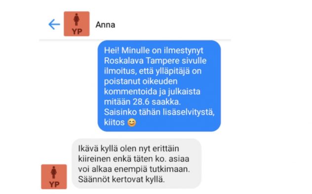 Anna -niminen ylläpitäjä vastasi suomalaisnaiselle ja kertoi ettei hänellä ole aikaa selvitellä, miksi hän sai bannit Facebook-ryhmään.
