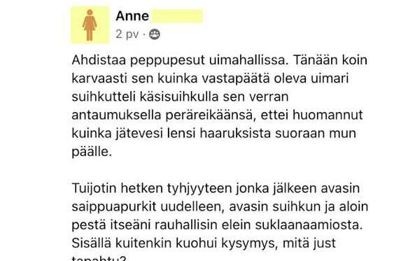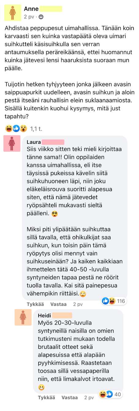 Eräs suomalaisnainen päätti jakaa ikävän uimahallissa sattuneen tapauksen muille ja sai minun yllätyksekseni muilta naisilta vertaistukea. En ole tiennyt, että naisten suihkuhuoneen puolella väistellään jätevesiä ja suihkutellaan vettä muiden päälle. En myöskään tiennyt, että alapään pesemisestä voidaan tehdä näin vaikeaa, sillä miesten puolella ei ole tullut koskaan vastaan tällaista. (Toki miesten puolella on muita haittapuolia, kuten pojat, jotka keksivät pissata kiukaalle).