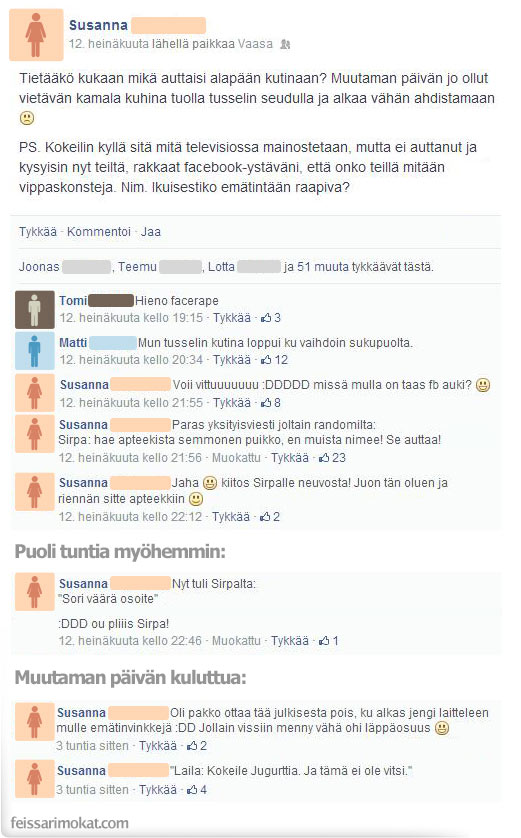 Suuttuisitkö tällaisesta? Mielestäni ’vitsi’ saattoi mennä hieman överiksi, sillä Susanna alkoi saamaan vinkkejä TUNTEMATTOMILTA henkilöiltä. Muun muassa jogurtti olisi voinut auttaa oireisiin…