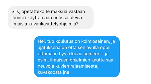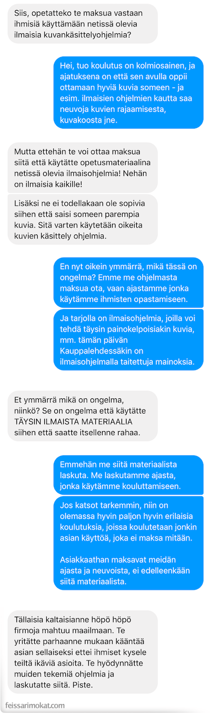 Feissarimokat.com bongasi yrittäjän ja asiakkaan välillä käydyn keskustelun. Asiakkaan mielestä yrittäjä ei saa laskuttaa asiakasta, jos hän opettaa tätä käyttämään ilmaisia palveluita. Asiakas ei tuntunut käsittävän, että tässä tapauksessa ei laskutetakaan ilmaisten ohjelmien vuoksi vaan ajasta, jota opettamiseen kuluu.