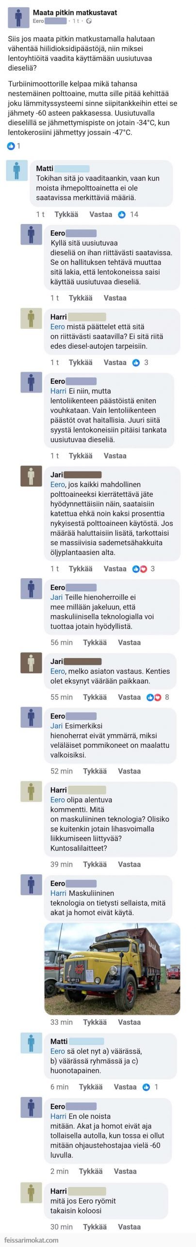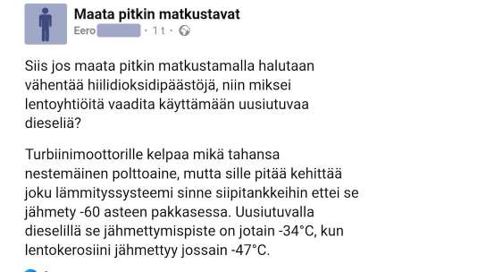 Uusiutuvan dieselin käyttö herätti keskustelua Facebookissa.