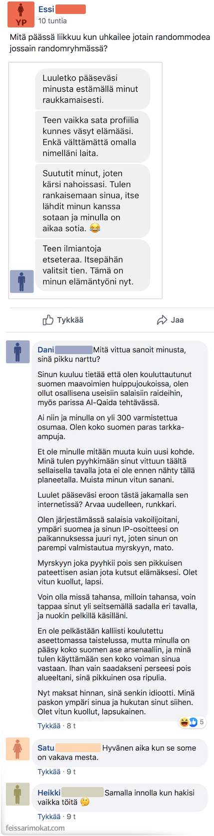 Feissarimokat: Essi poisti suomalaismiehen ryhmästä ja sai kamalan määrän uhkauksia