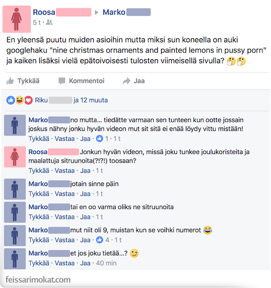 Feissarimokat: Google jäi auki — miehen häröt hakusanat avautuivat tyttöystävän näkyville