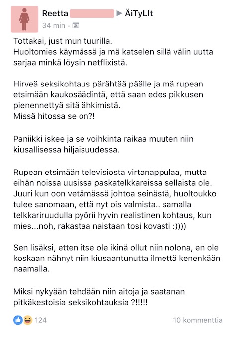 Reetta kertoo nolosta tilanteesta, jossa taloyhtiön huoltomies tuli kylään juuri silloin kun Netflixisissä pyöri kiihkeä seksikohtaus. Suomalaisnainen ei löytänyt kaukosäädintä tai onnistunut muutenkaan saamaan televisiota hiljaiseksi.