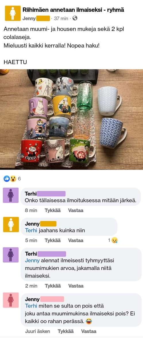 Jenny julkaisi Riihimäen annetaan ilmaiseksi -ryhmässä poikkeuksellisen julkaisun, jossa hän kertoi antavansa muumi- ja housen mukeja ilmaiseksi.