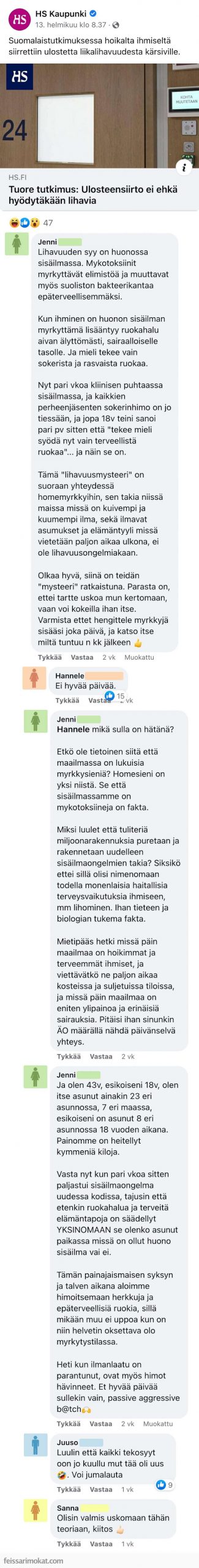 Liikalihavuus on todellinen ongelma modernissa yhteiskunnassa, johon yritetään keksiä erilaisia ratkaisuja. Yksi viime aikoina puheenaiheena olleista hoitomenetelmistä on ulosteensiirto, jossa ilmeisesti tarkoituksena on siirtää hoikan ihmisen hyviä suolistobakteereja lihavalle ihmiselle. HS:n mukaan uusimmat tutkimustulokset kuitenkin viittaisivat siihen, ettei hoitomenetelemästä olekaan hyötyä lihaville.