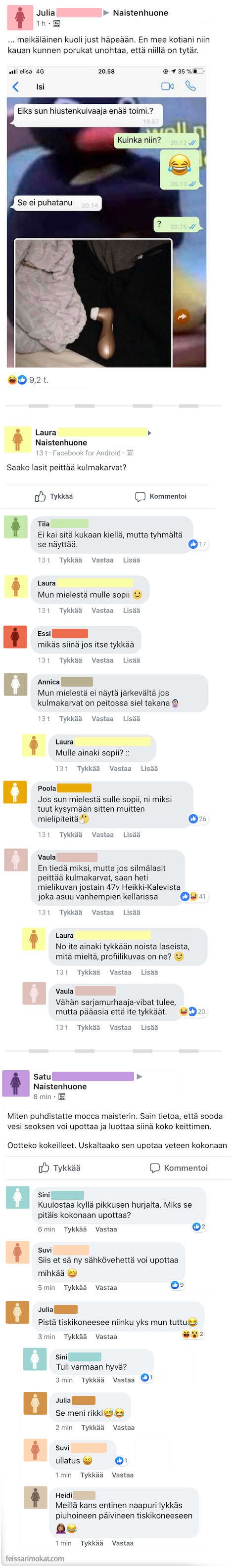 Lisäksi toinen nainen kysyi kuinka hän voisi pestä mocca maisterin. Hän oli ajatellut, että kahvinkeittimen voisi upottaa sooda-vesiliukseen. Toiset kuitenkin huomauttivat ettei sähkölaitteita kannata upottaa veteen, koska ne menevät rikki.