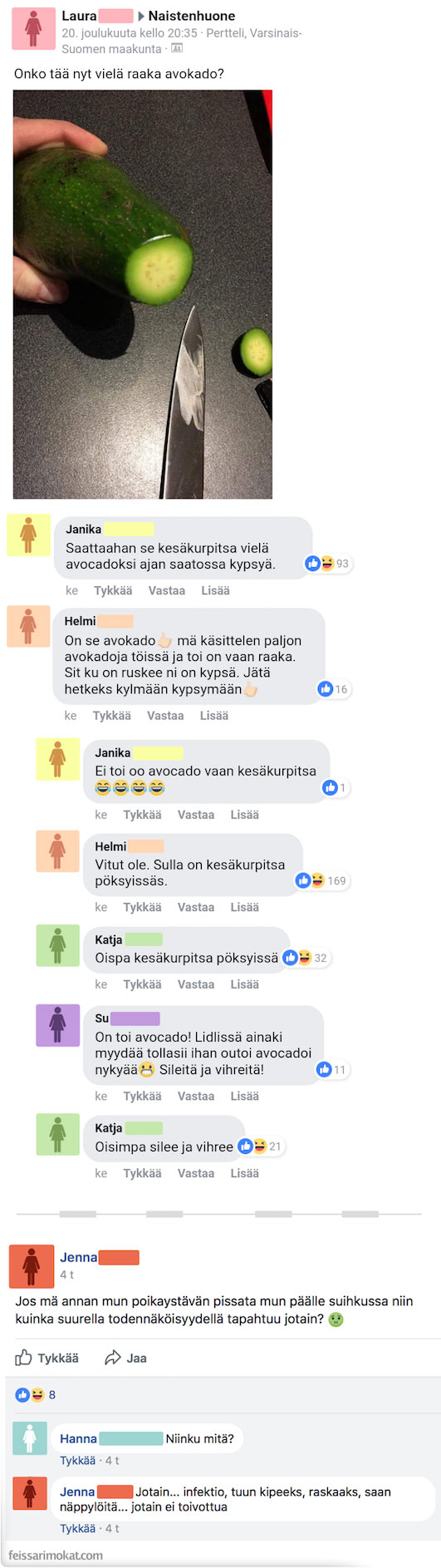 Voit lukea alta Jennan suihkussa pissaamiseen liittyvän ongelman. Laura oli ostanut kaupasta avokadon, joka näyttää ainakin minun silmääni raa’alta. Osa ihmisistä oli sitä mieltä, että kyseessä ei ollut avokado vaan ennemminkin kesäkurpitsa. Oli miten oli – keskustelu lähti nopeasti aivan uusille raiteille, kun naiset alkoivat puhumaan pöksyissä olevasta kesäkurpitsasta.