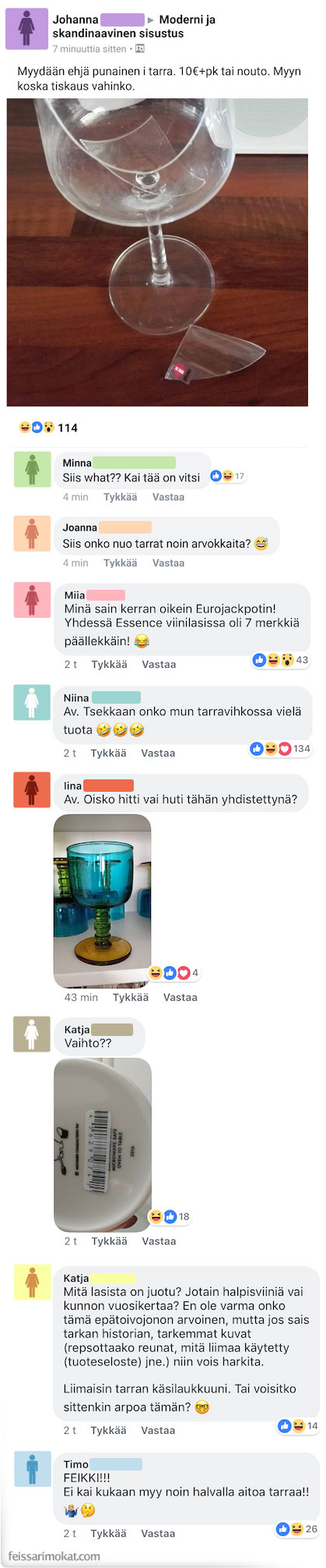 Feissarimokat: Johannan viinilasi hajosi – yritti kaupata pelkkää Iittalan tarraa naurettavalla hinnalla
