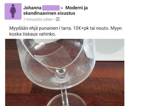 Johanna päätti tämän seurauksena pistää Iittalan TARRAN myyntiin Facebookin ”Moderni ja Skandinaavinen sisustus” -ryhmässä. Johannan lasi oli mennyt rikki tiskauksen yhteydessä, mutta tarra oli onneksi säilynyt ehjänä.