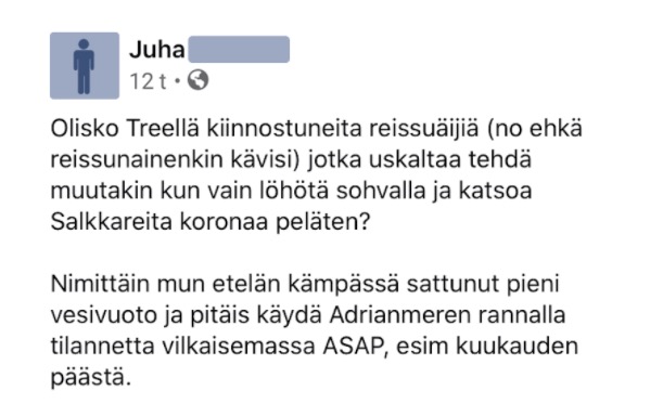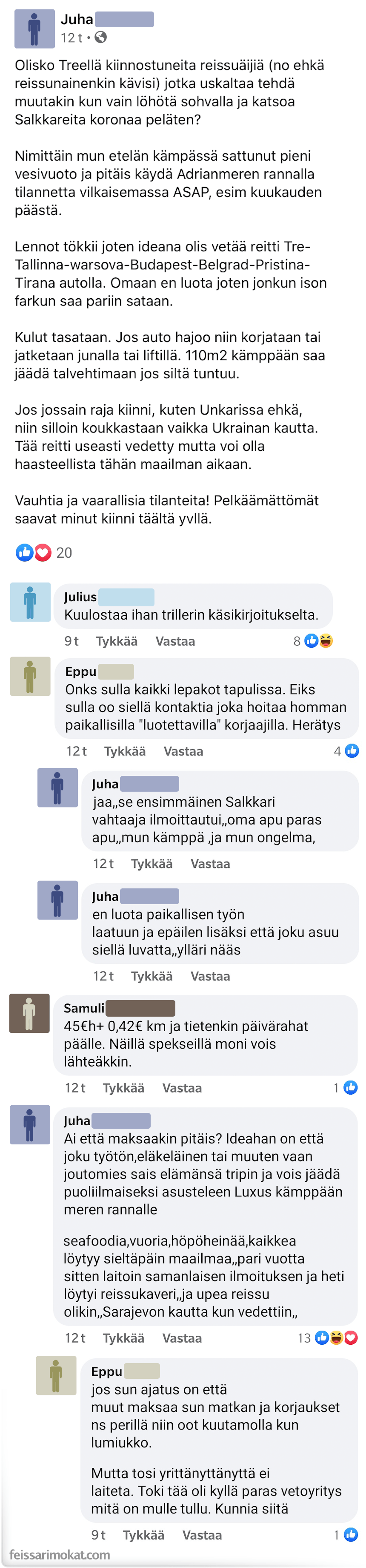 Juha kertoi, että matka olisi kaikkien mukaan tulijoiden osalta omakustanteinen Adrianmerellä olevaa kämppää lukuunottamatta. Täytyy sanoa, että maailman tilanne huomioon ottaen tarjous ei kuulosta kovin houkuttelevalta. Jos koronaa ei olisi, niin moni varmasti lähtisi Juhan matkaan.