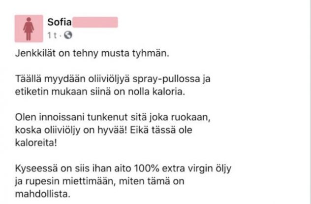 Jenkeissä asuva Sofia oli ostanut kaupasta oliiviöljyä, joka ei sisällä lainkaan kaloreita. Pienen tutkinnan jälkeen kävi kuitenkin ilmi, että oliiviöljy sisältää kaloreita, mutta yksi suihkautus sisältää niin vähän kaloreita, että summan voi pyöristää nollaan. Jenkit ovat kyllä eteviä markkinoijia!